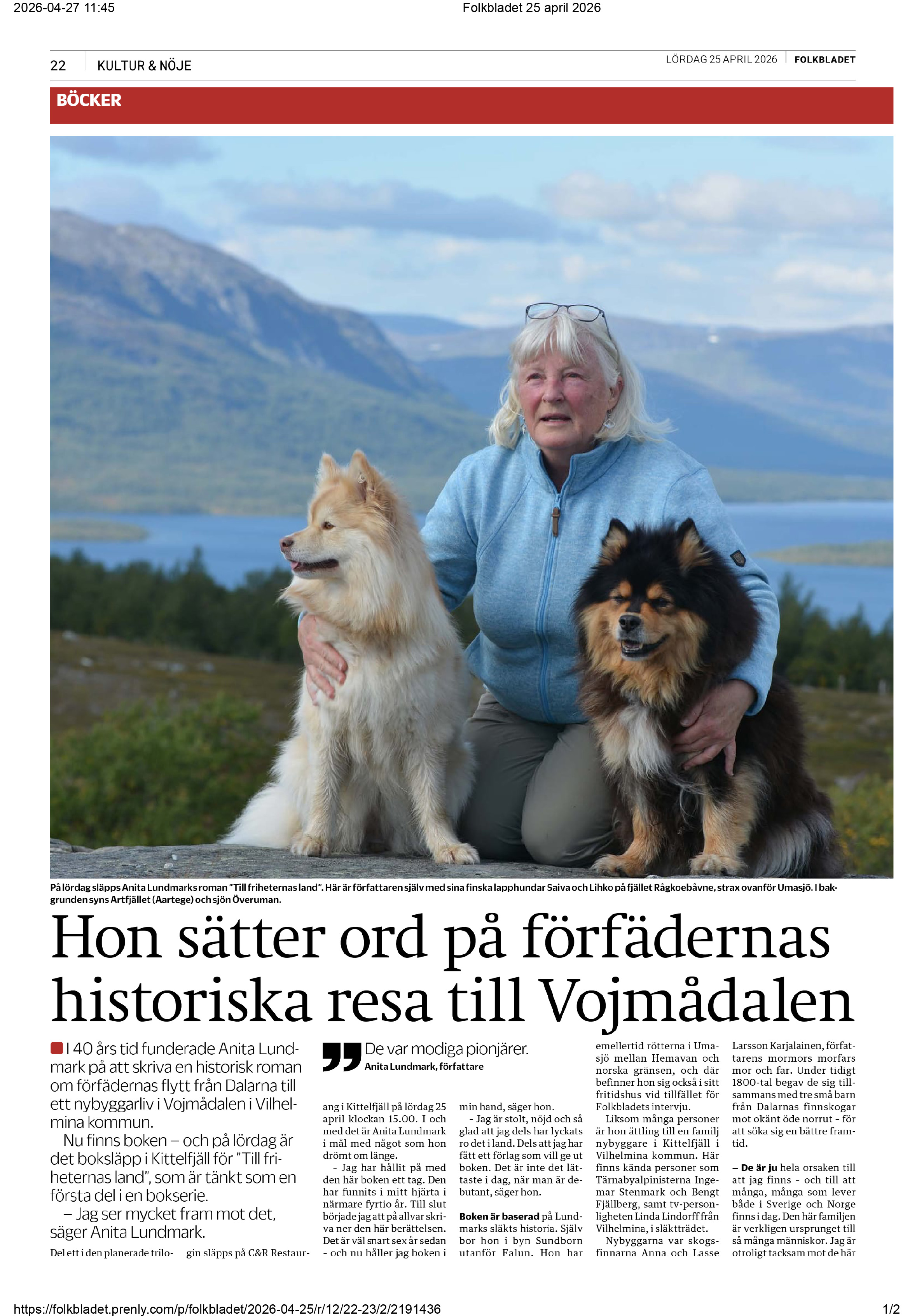 Boksläpp för Anita Lundmarks historiska roman "Till friheternas land", närmar sig! Det äger rum den 25 april i Kittelfjäll. läs mer HÄR!.